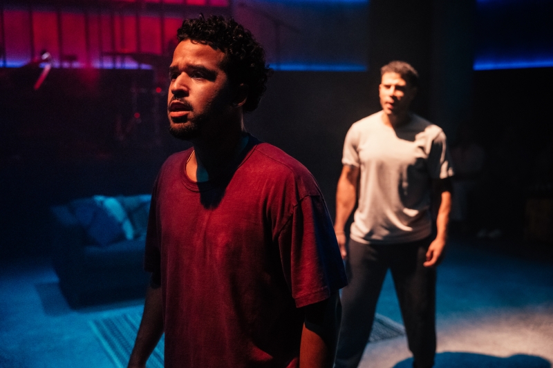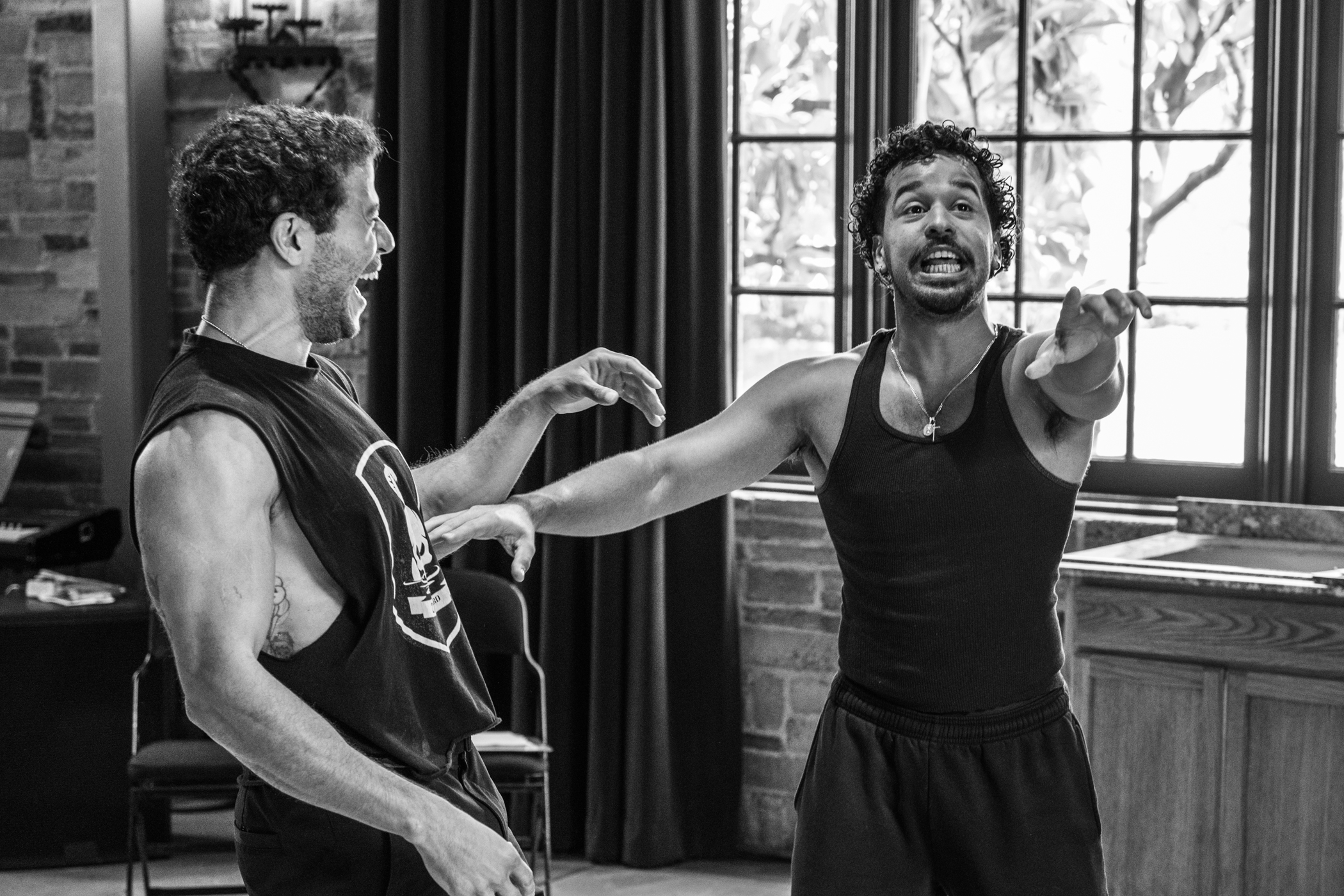 L-R: Alex Hernandez and Marlon Alexander Vargas in rehearsal for littleboy/littleman at Geffen Playhouse. Photo by Jeff Lorch.