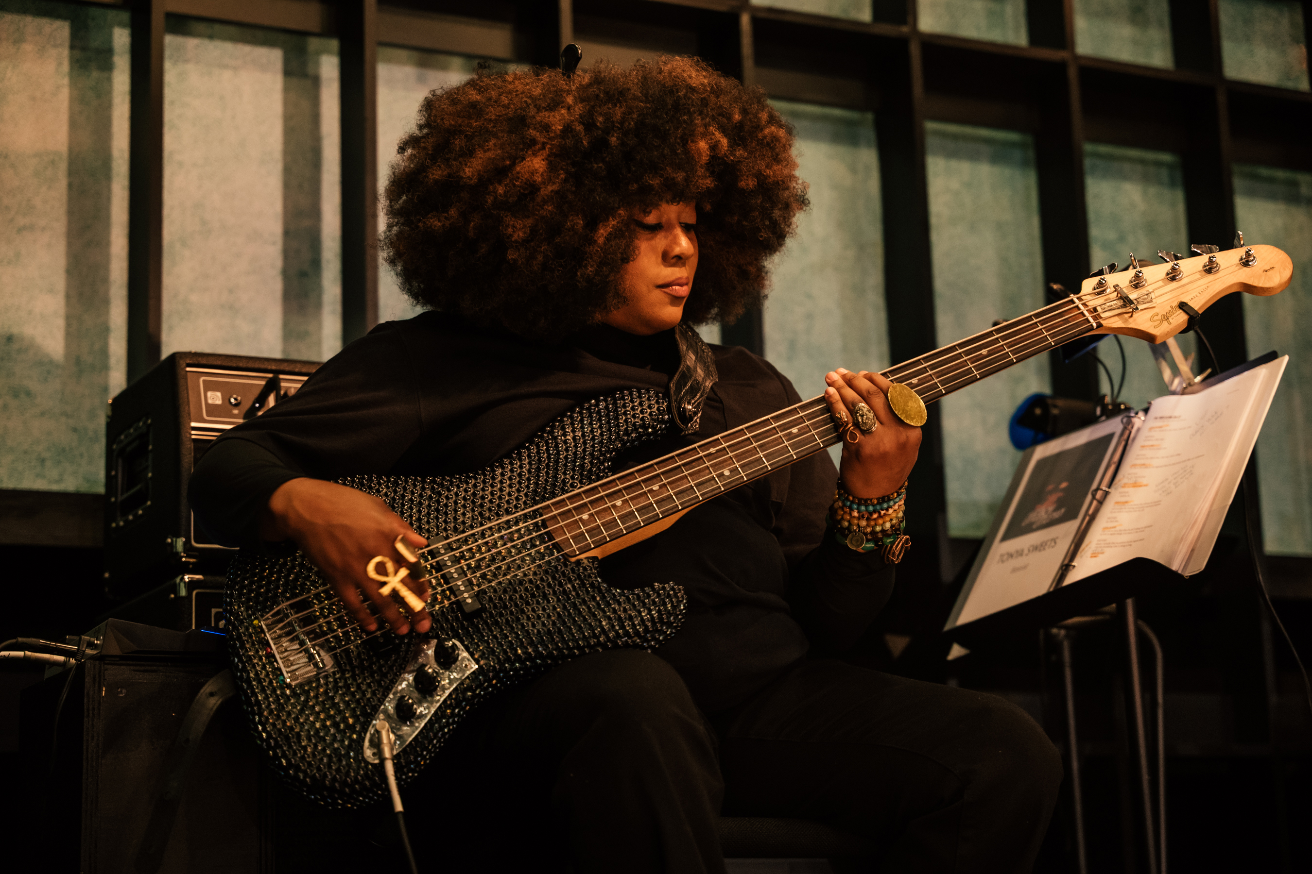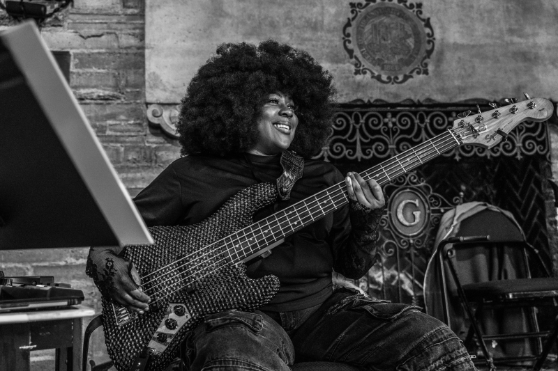 Bassist Tonya Sweets in rehearsal for littleboy/littleman at Geffen Playhouse. Photo by Jeff Lorch.
