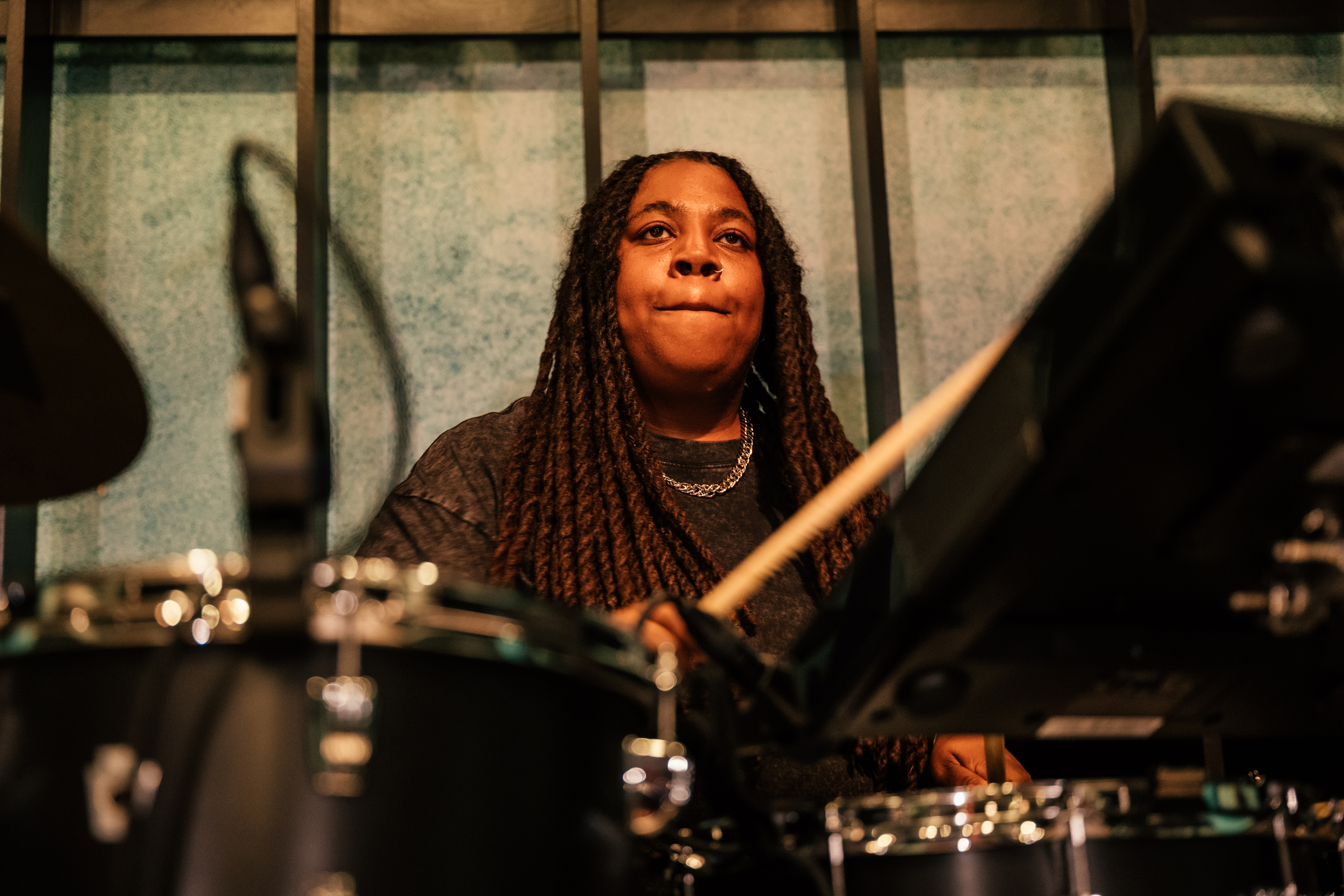 Drummer Dee Simone in rehearsal for littleboy/littleman at Geffen Playhouse. Photo by Jeff Lorch.
