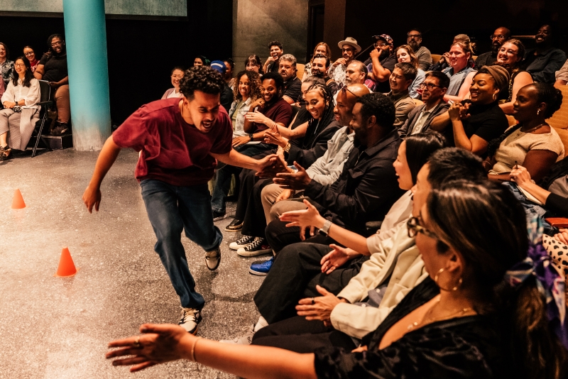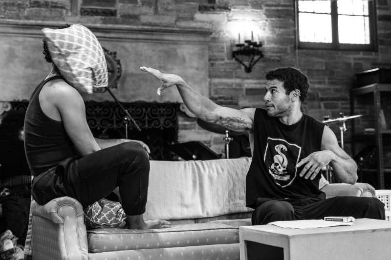 L-R: Alex Hernandez and script assistant Rediet Yared in rehearsal for littleboy/littleman at Geffen Playhouse. Photo by Jeff Lorch.