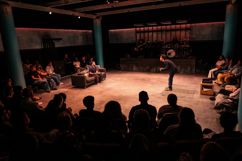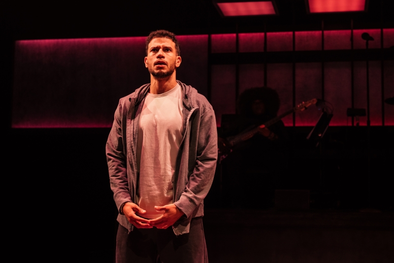 L-R: Alex Hernandez and bassist Tonya Sweets in littleboy/littleman at Geffen Playhouse. Directed by Nancy Medina. Photo by Jeff Lorch.
