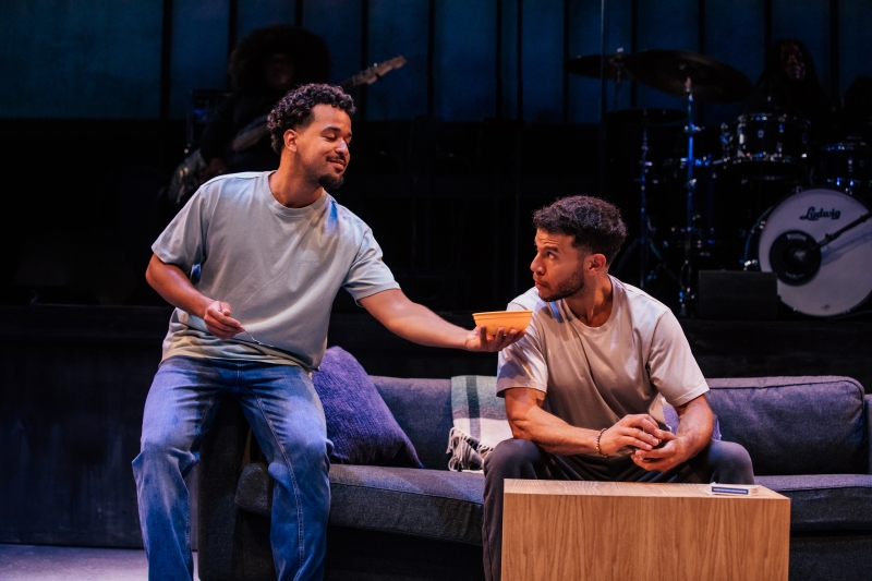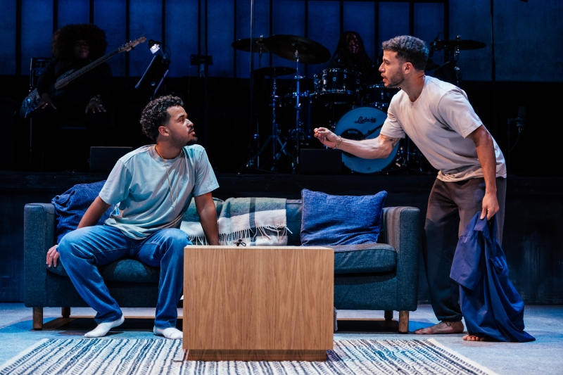 L-R: Marlon Alexander Vargas and drummer Dee Simone in rehearsal for littleboy/littleman at Geffen Playhouse. Photo by Jeff Lorch.