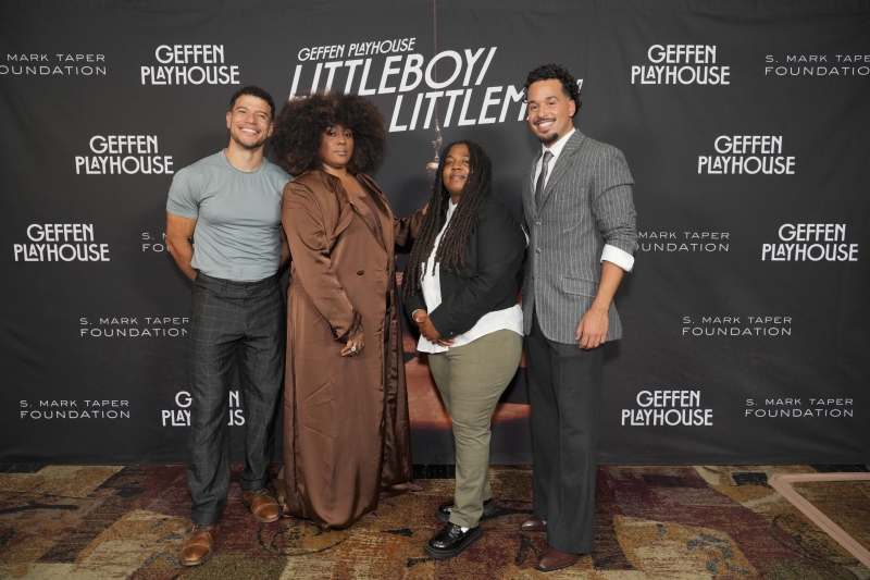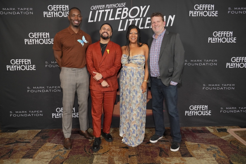 L-R: Geffen Playhouse Artistic Director Tarell Alvin McCraney, playwright Rudi Goblen, director Nancy Medina and Geffen Playhouse Executive Director/CEO Gil Cates, Jr. at the October 9, 2025, Opening Night of littleboy/littleman at Geffen Playhouse. Photo by Jordan Strauss.