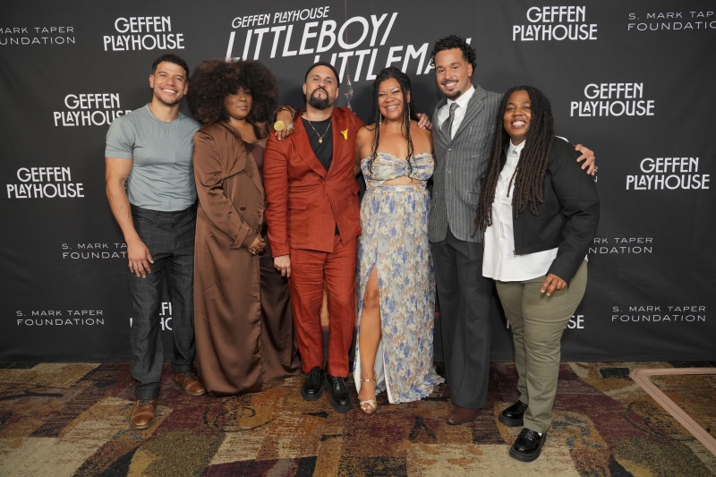 L-R: Alex Hernandez, bassist Tonya Sweets, playwright Rudi Goblen, director Nancy Medina, Marlon Alexander Vargas and drummer Dee Simone at the October 9, 2025, Opening Night of littleboy/littleman at Geffen Playhouse. Photo by Jordan Strauss.