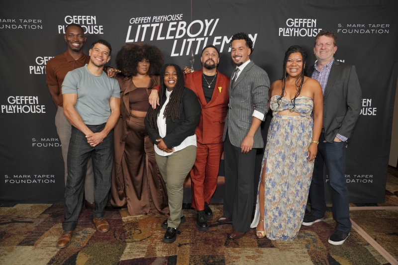 L-R: Geffen Playhouse Artistic Director Tarell Alvin McCraney, Alex Hernandez, bassist Tonya Sweets, drummer Dee Simone, playwright Rudi Goblen, Marlon Alexander Vargas, director Nancy Medina and Geffen Playhouse Executive Director/CEO Gil Cates, Jr. at the October 9, 2025, Opening Night of littleboy/littleman at Geffen Playhouse. Photo by Jordan Strauss.