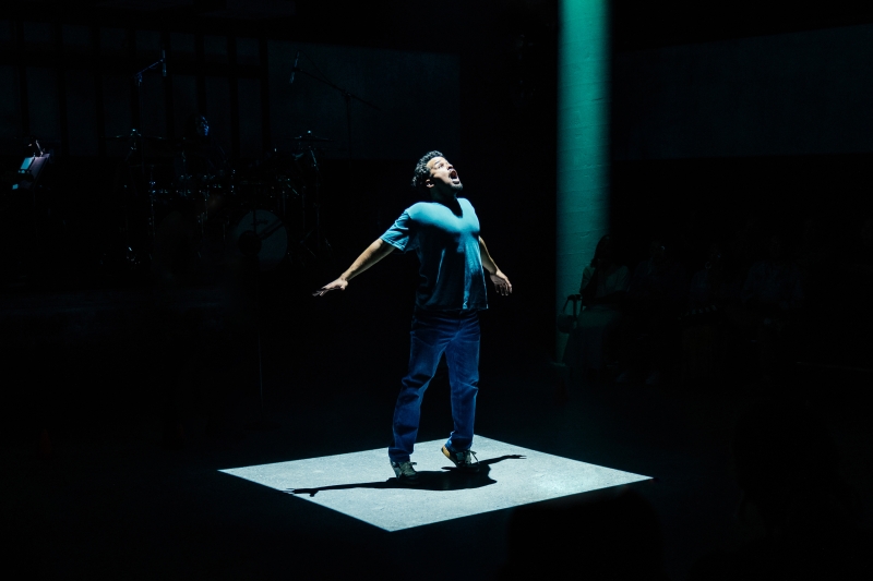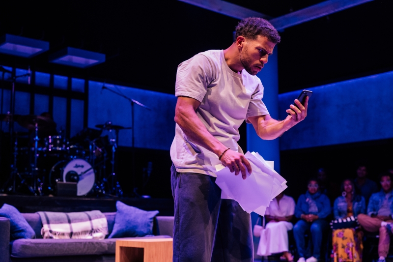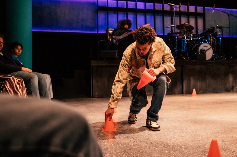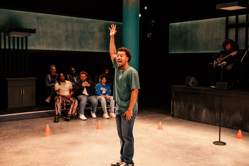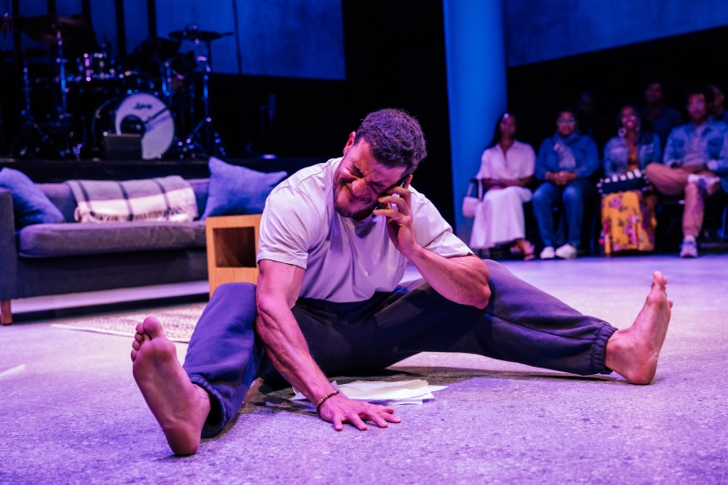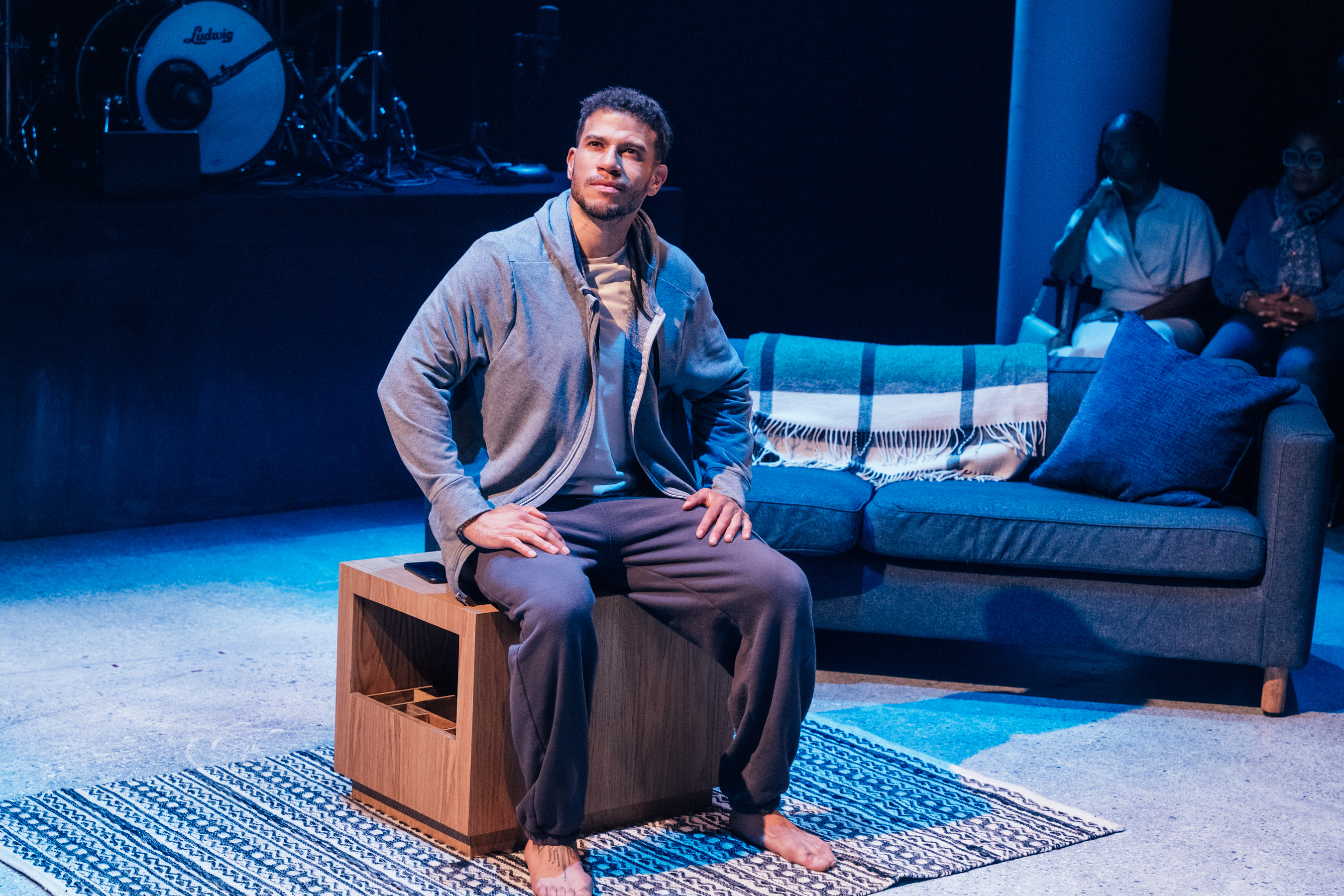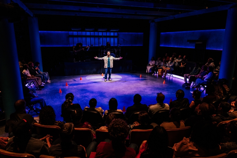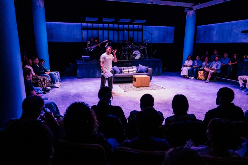 L-R: Drummer Dee Simone, Marlon Alexander Vargas and Audience in littleboy/littleman at Geffen Playhouse. Directed by Nancy Medina. Photo by Jeff Lorch.