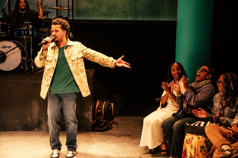 L-R: Bassist Tonya Sweets, Marlon Alexander Vargas, Drummer Dee Simone and Audience in littleboy/littleman at Geffen Playhouse. Directed by Nancy Medina. Photo by Jeff Lorch.