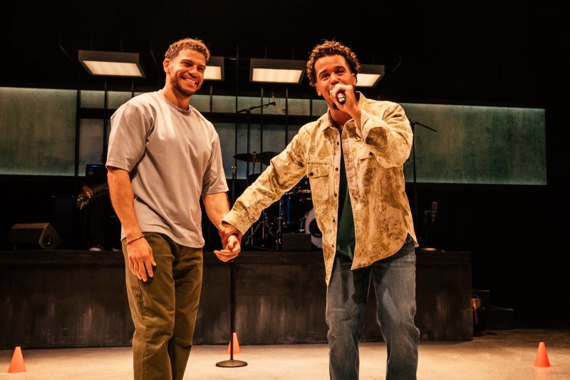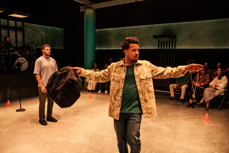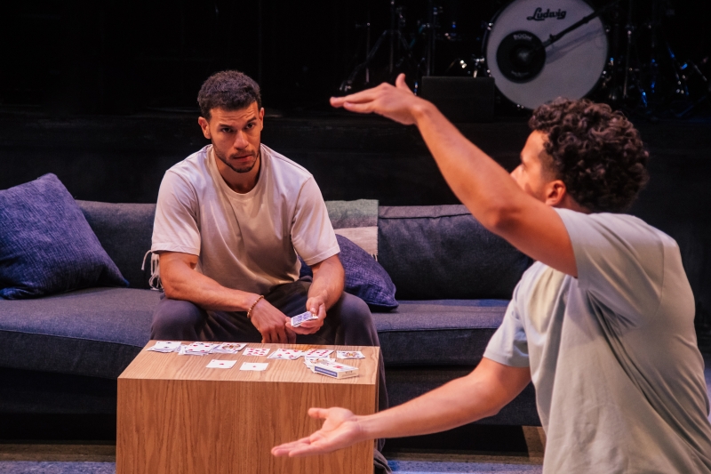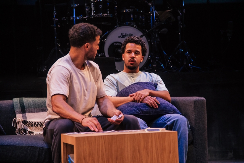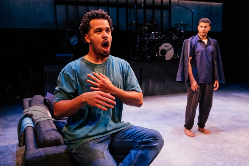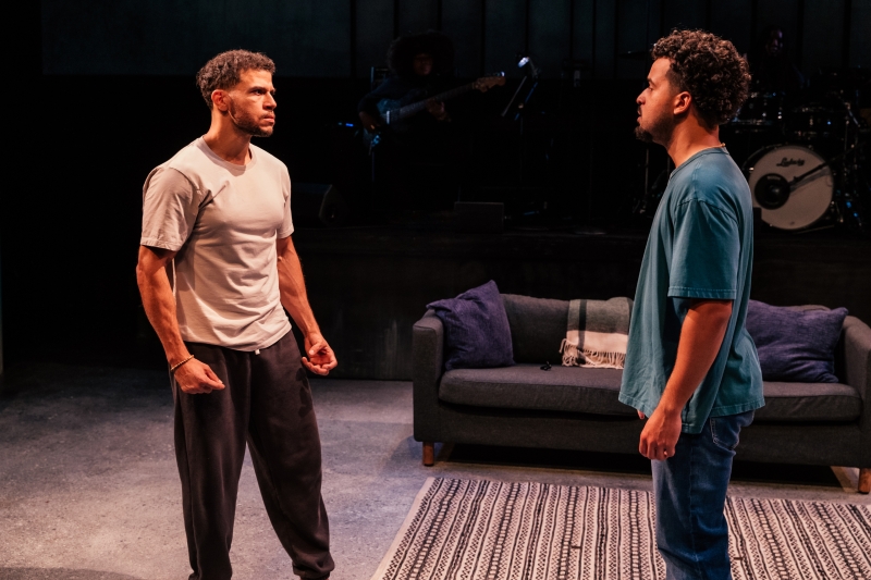 L-R: Drummer Dee Simone and Alex Hernandez in littleboy/littleman at Geffen Playhouse. Directed by Nancy Medina. Photo by Jeff Lorch.
