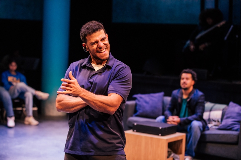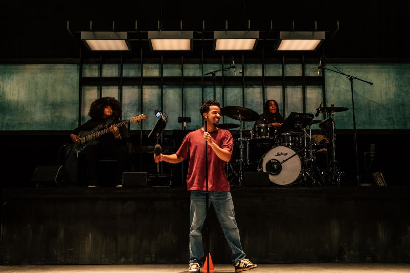 L-R: Bassist Tonya Sweets, Marlon Alexander Vargas and drummer Dee Simone in littleboy/littleman at Geffen Playhouse. Directed by Nancy Medina. Photo by Jeff Lorch.