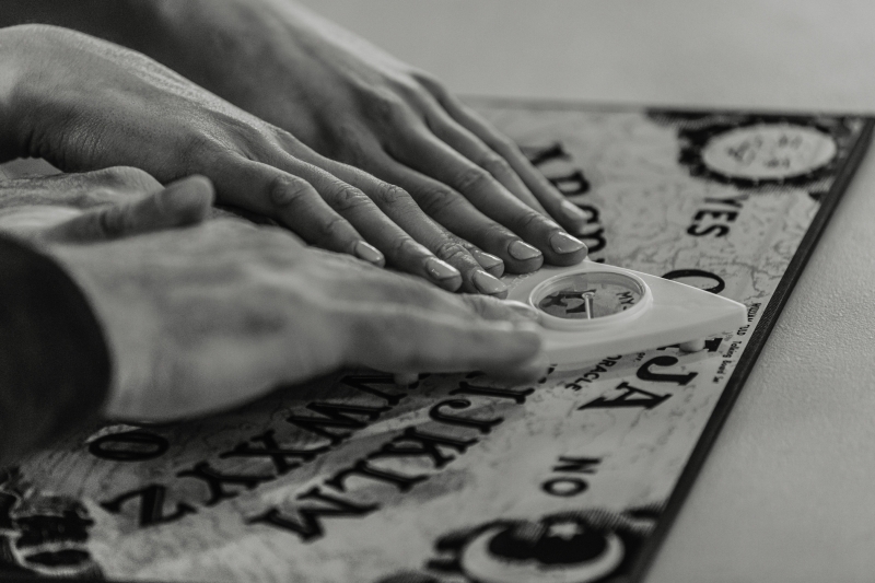 L-R: Cillian O'Sullivan and Marianna Gailus using a Ouija board in rehearsal for SYLVIA SYLVIA SYLVIA at Geffen Playhouse. Photo by Jeff Lorch.