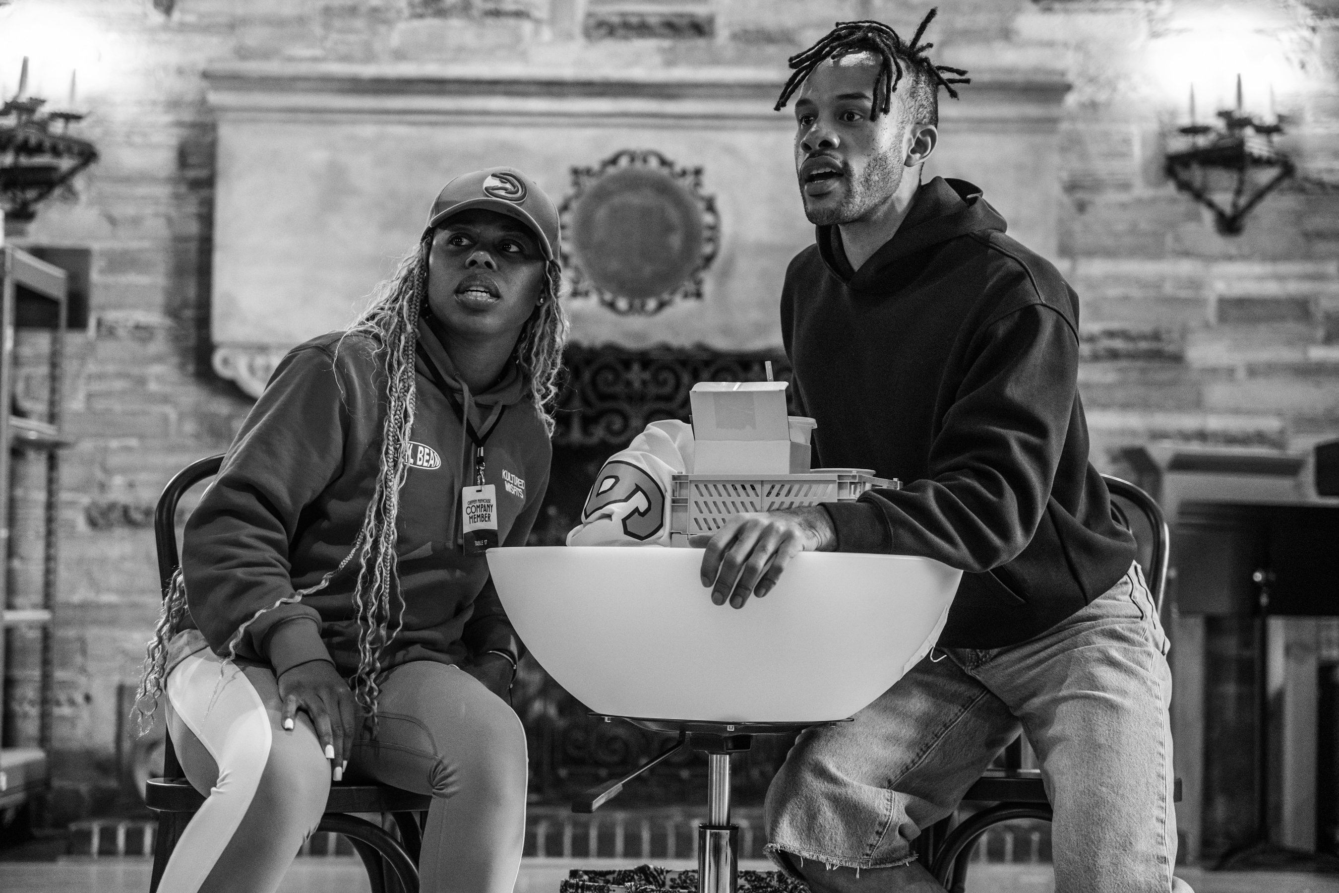 L-R: Biko Eisen-Martin and assistant stage manager Lydia Runge in rehearsal for Table 17 at Geffen Playhouse. Photo by Jeff Lorch.