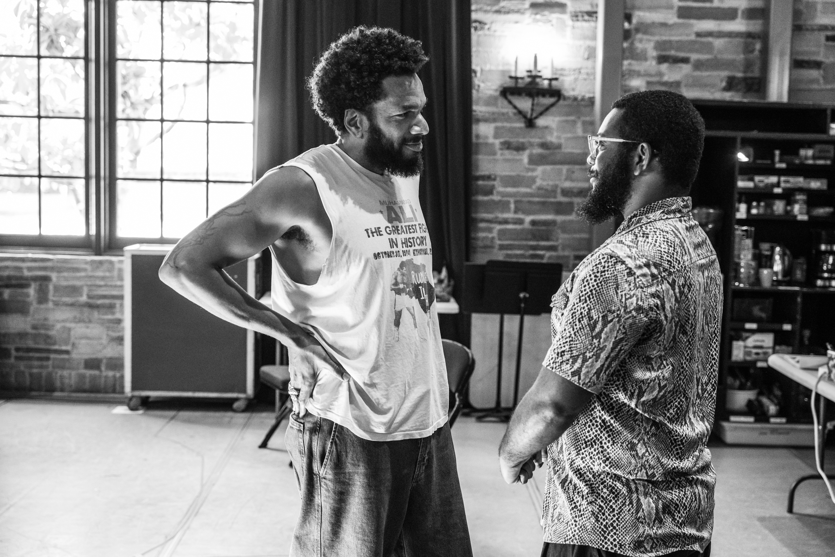 L-R: Biko Eisen-Martin and director Zhailon Levingston in rehearsal for Table 17 at Geffen Playhouse. Photo by Jeff Lorch.
