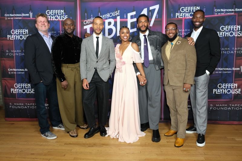 L-R: Geffen Playhouse Executive Director/CEO Gil Cates, Jr., playwright Douglas Lyons, Michael Rishawn, Gail Bean, Biko Eisen-Martin, director Zhailon Levingston, and Geffen Playhouse Artistic Director Tarell Alvin McCraney at the November 13, 2025 Opening Night of Table 17 at Geffen Playhouse. Photo by Birdie Thompson.