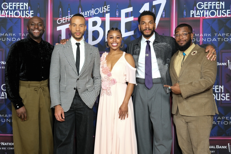 L-R: Playwright Douglas Lyons, Michael Rishawn, Gail Bean, Biko Eisen-Martin and director Zhailon Levingston at the November 13, 2025 Opening Night of Table 17 at Geffen Playhouse. Photo by Birdie Thompson.