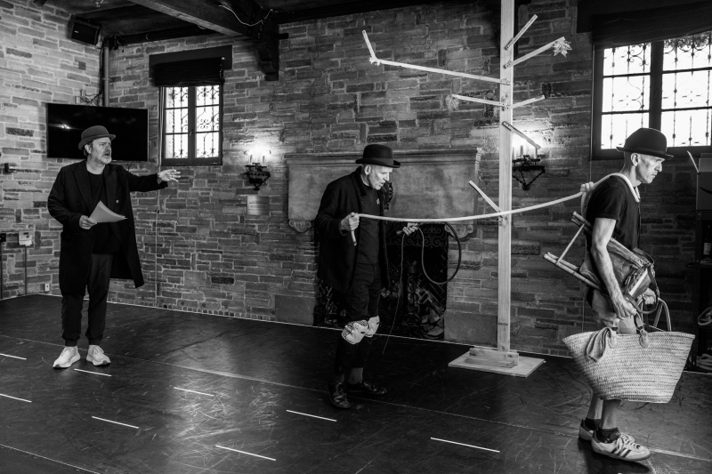 L-R: Rainn Wilson, Conor Lovett and Adam Stein in rehearsal for Waiting for Godot at Geffen Playhouse. Photo by Jeff Lorch.